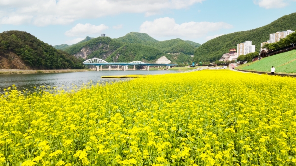 13일 단양읍은 봄꽃들이 꽃망울을 터트리는 5월 단양강변에 유채꽃이 꽃 대궐을 이루며 코로나로 힘든 시간을 보내고 있는 주민들과 관광객들에게 도심 속 치유와 힐링의 공간으로 자리매김하고 있다고 밝혔다.