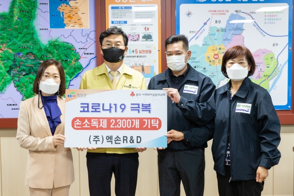 [충청뉴스큐] 경기 안산시 소재 ㈜엑손R&D가 지난 12일 청양군을 방문해 저소득 노인가구를 위해 써달라며 손소독제 2,300개를 기탁했다.