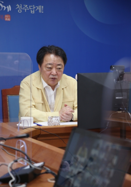 [충청뉴스큐] 한범덕 청주시장이 17일 소회의실에서 온라인 영상회의로 열린 주간업무 보고회에서 시민 방역수칙 참여 등을 강조했다.