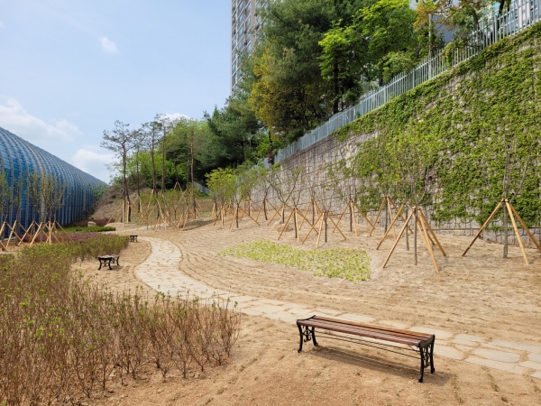 시는 이 일대 방음벽과 옹벽사이 공간을 숲으로 조성하고 소나무, 복자기, 산수유 등 교목 49주와 조팝나무, 남천 등 관목 3,330주를 식재해 아름다운 경관을 창출했다.