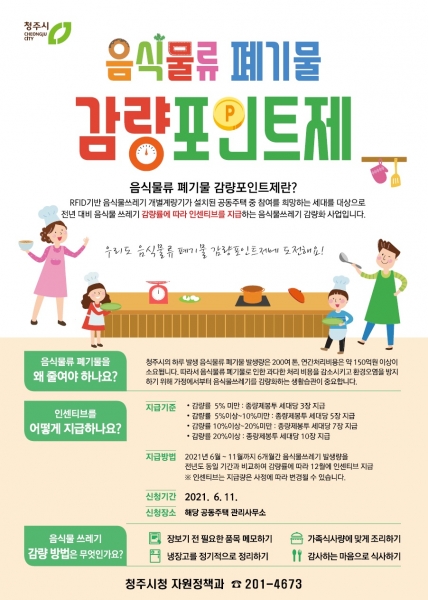 [충청뉴스큐] 청주시가 음식물류 폐기물 발생 억제와 감량을 위해 오는 11일까지 음식물 폐기물 감량포인트제 신청가구를 모집한다.