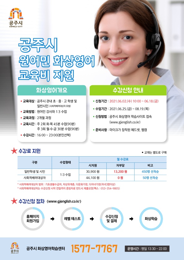[충청뉴스큐] 공주시가 올해 처음으로 ‘원어민 화상영어교육’을 시행키로 하고 6월 2일부터 18일까지 1기 수강생을 모집한다.