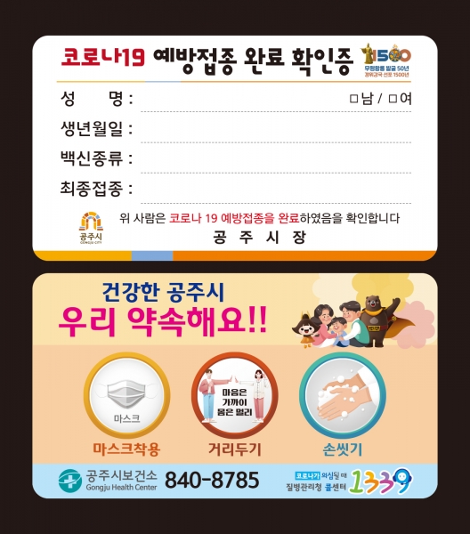 확인증은 간단한 인적사항과 함께 백신 종류, 접종 날짜 등이 표기되고 뒷면에는 마스크 착용과 거리두기, 손씻기 등 코로나19 생활방역 수칙과 보건소 연락처 등이 담겼다.