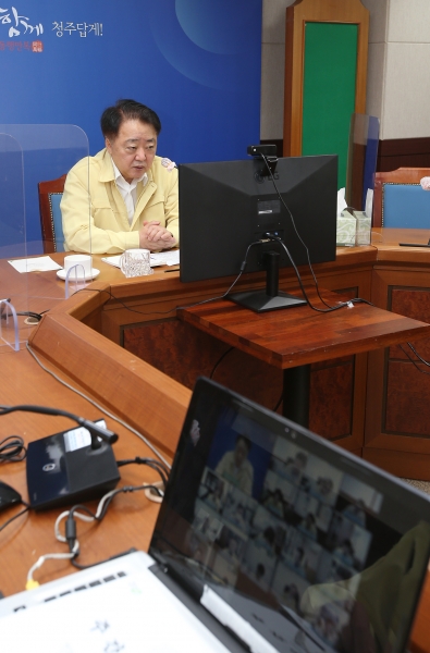 [충청뉴스큐] 한범덕 청주시장이 7일 소회의실에서 온라인 영상회의로 열린 주간업무 보고회에서 코로나 시대에는 방역이 최우선이라고 강조했다.