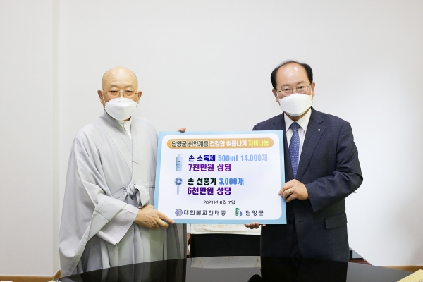 [충청뉴스큐] 충북 단양군은 지난 7일 대한불교 천태종 구인사에서 안전취약계층을 위한 후원물품으로 손선풍기 3000개를 전달했다고 밝혔다.