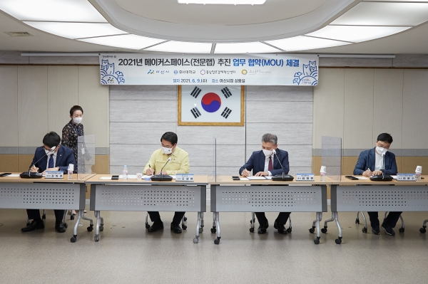 [충청뉴스큐] 아산시가 중소벤처기업부에서 모집하는 메이커 스페이스 전문랩 구축을 추진하고자 9일 주관기관인 호서대학교와 참여기관인 충남도·충남창조경제혁신센터·소나기커뮤니케이션과 업무협약을 체결했다.