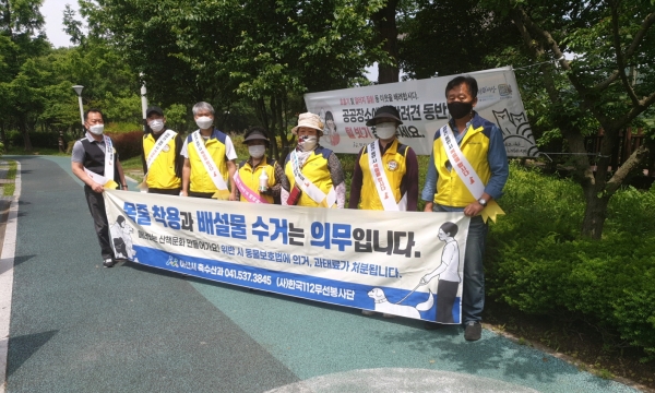 [충청뉴스큐] 아산시가 동물보호명예감시원인 사)한국 112무선봉사단을 주축으로 신정호 호수공원 산책로에서 반려동물 펫티켓 캠페인을 실시했다.