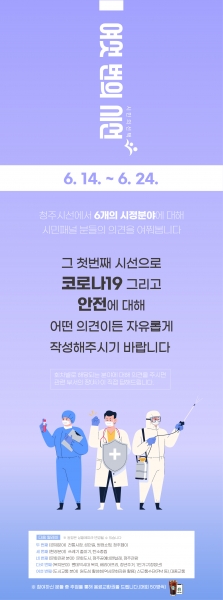 그 중 첫 번째 분야인 안전 관련 이슈에 대해서는 오는 14일부터 24일까지 10일간 진행하며 만 14세 이상 청주시민이라면 누구나 청주시선 홈페이지에서 시민패널 가입 후 댓글게시판에 의견을 남겨 참여할 수 있다.