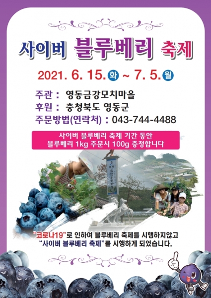 [충청뉴스큐] 청정지역의 따뜻한 햇살과 바람을 받고 자란 영동금강모치마을의 명품 블루베리를 만날 수 있는 ‘사이버 블루베리 축제’가 이달 15일부터 다음달 5일까지 3주간 온라인으로 개최된다.