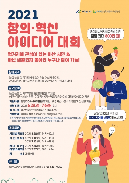 [충청뉴스큐] 아산시 농촌신활력플러스사업 추진단은 농업·농촌 및 먹거리문제를 창의적으로 해결할 수 있는 주민조직을 발굴하고 사업 가능한 모델을 지원하기 위해 ‘2021년 창의·혁신 아이디어 대회’를 실시한다.
