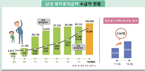 고용노동부에 따르면, ‘2018년 6월 말 기준으로 남성 육아휴직급여 수급자 수는 8,463명으로 전체 육아휴직자 중 16.9%를 차지하여, 전년 동기 11.4%였던 것에 비해 5.5%p 증가한 것으로 나타났으며, “아빠육아휴직보너스제” 이용자 수도 3,093명으로 전년 동기 2,052명 대비 50.7% 증가했다.