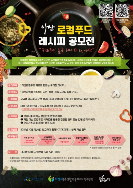 [충청뉴스큐] 아산시농촌신활력플러스추진단과 ㈜청그라미가 아산 로컬푸드 레시피 공모전 ‘구해줘 홈쿡 레시피 in 아산’을 지난 1일부터 공모 중이다.