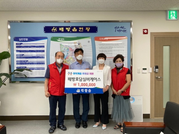 [충청뉴스큐] 아산시 배방읍 북수리에 위치한 배방효담실버케어스가 7월 5일 배방읍 행복키움추진단에 후원금 100만원을 전달했다.
