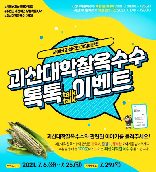 군은 명품 괴산대학찰옥수수 100개를 준비해 이벤트에 응모한 사람 중 100명을 뽑아 택배로 선물할 계획이라고 전했다.