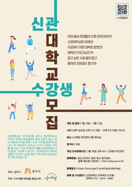 ‘신관대학교’는 오는 18일 개강해 9월 12일까지 매주 일요일 신관동 행정복지센터에서 진행될 예정으로 사회학·인문학·경제학·교양 등 과목별 다양한 프로그램이 운영된다.