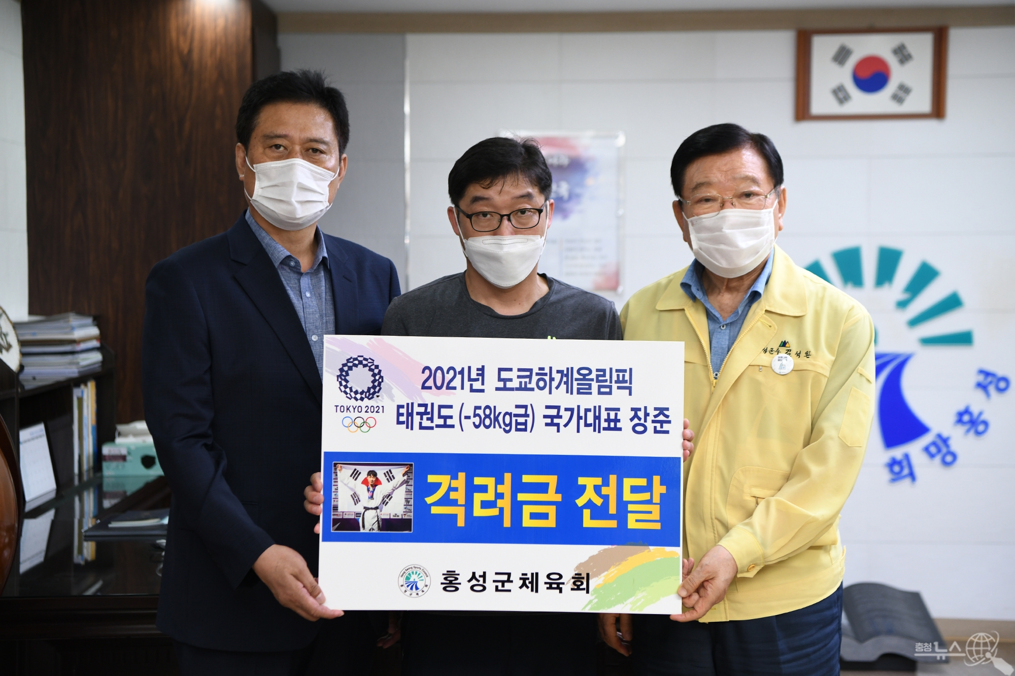 김석환 홍성군수와 백승균 홍성군체육회장은 지난 16일 홍성군청에서 태권도 국가대표 장준 선수의 부친인 장인수씨에게 금일봉을 전달하며 장 선수의 선전을 기원했다.