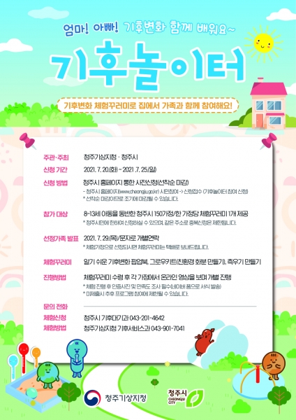 [충청뉴스큐] 청주시는 7월 20일부터 25일까지 6일간 기후변화와 탄소중립 인식확산을 위한 비대면 체험프로그램인 ‘기후놀이터’를 청주기상지청과 공동으로 운영하기로 했다.
