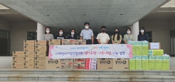 이날 아산시기업인협의회 회원사 ㈜프레스코, ㈜동원제관, ㈜천지건업, 태평양에어콘트롤공업, ㈜열린문디자인, ㈜에이티이엔지, ㈜삼아인터내셔날, 오마샤리프화장품가 참여해 즉석밥, 김, 라면, 휴지, 과자, 화장품 등을 마련했으며 선장면과 온양4동 행정복지센터, 통합사례관리사를 통해 취약계층에 지원될 예정이다.
