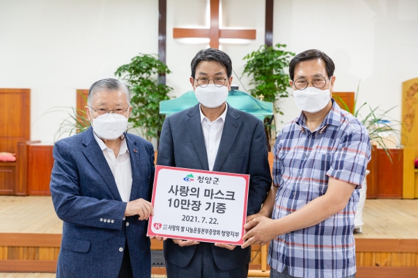 [충청뉴스큐] 사랑의쌀나눔운동본부중앙회 청양지부가 지난 22일 청양군청을 방문, 코로나19 의료 취약계층과 저소득층을 위해 써달라며 덴탈마스크 10만 장을 기탁했다.