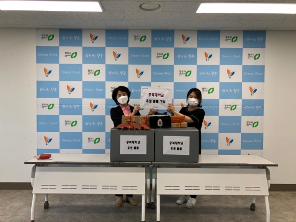 [충청뉴스큐] 충북대학교 재학생들이 23일 청주시 아동보육과 드림스타트팀에 직접 만든 에코백, 천연비누, 가죽파우치 등 150개 가량의 물품을 전달했다.