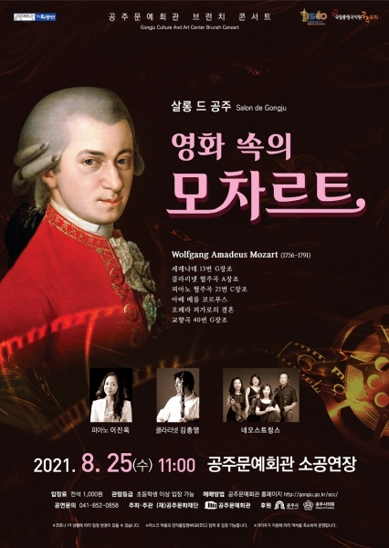 [충청뉴스큐] 공주문예회관이 오는 8월 25일 오전 11시에 공주문예회관 소공연장에서 ‘살롱 드 공주 ‘영화 속의 모차르트’’ 공연을 선보인다.