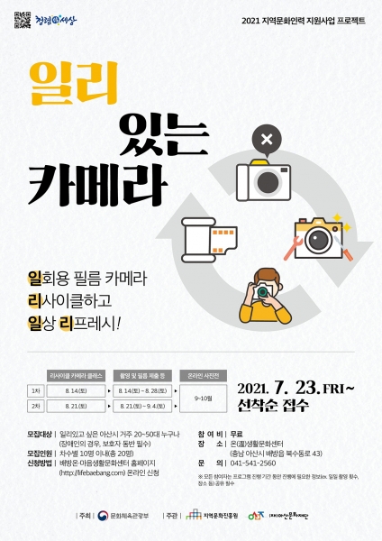 올여름 ‘일’회용 필름 카메라를 ‘리’사이클하고 ‘일’상을 ‘리’프레시 해보자. 아산시에 거주하는 20~50대를 대상으로 진행하는 ‘일리 있는 카메라’는 리사이클 카메라 클래스와 온라인 사진전으로 구성돼 있으며 감성과 재미, 환경까지 세 마리 토끼를 잡을 수 있는 프로그램이다.