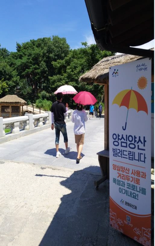 이에 시는 발열 체크, 입장객 안심콜 등 코로나19 확산 방지를 위한 노력을 지속하는 한편 폭염대책기간 양심양산 대여 서비스를 실시해 관광객들이 안전하고 시원하게 외암마을을 둘러볼 수 있도록 최선을 다하고 있다.