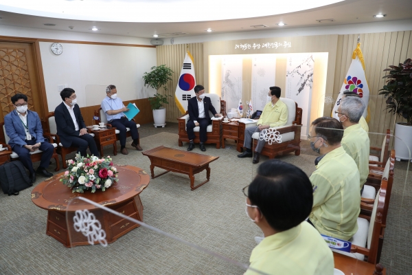 [충청뉴스큐] 맹정호 서산시장이 지난 9일 충남도청에서 안도걸 기획재정부 2차관을 만나 주요현안인 ‘가로림만 해양정원 조성’과 ‘충남공항 건설’을 건의했다.
