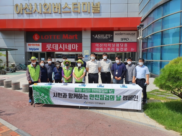 이날 아산시 안전총괄과와 대중교통과, 아산소방서 전기안전공사, 가스안전공사 아산시 안전관리자문단, 안전보안관이 참여해 합동 시설물 안전 점검 연계 안전 점검의 날 캠페인을 실시했다.
