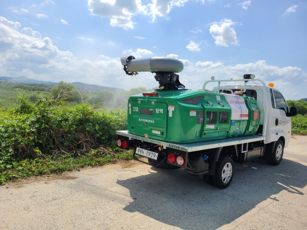 4,500여만원의 예산으로 구매한 방역소독 차량은 1t 차량에 800ℓ 소독약을 탑재할 수 있도록 맞춤 제작했으며 자동변속 기어를 장착하고 물 보충과 소독약 희석이 편리하도록 소독약 탑재 부분을 낮춰 비상시에는 축수산과 직원 누구나 방역에 임할 수 있도록 했다.