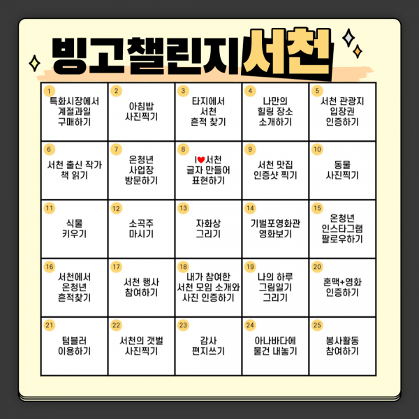총 25가지 미션을 전부 완수할 시에 자동으로 이벤트 추첨에 응모되며 제공되는 올빙고 빙고판을 필수 해시태그인 #서천_빙고챌린지 #온청년 #서천군청년네트워크와 함께 본인 SNS 계정에 포스팅하면 된다.