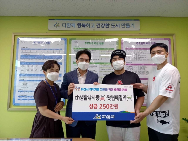 [충청뉴스큐] ch생활낚시광·왓썹패밀리가 지난 26일 아산시에 취약계층 아동 지원 성금 250만원을 기부했다.