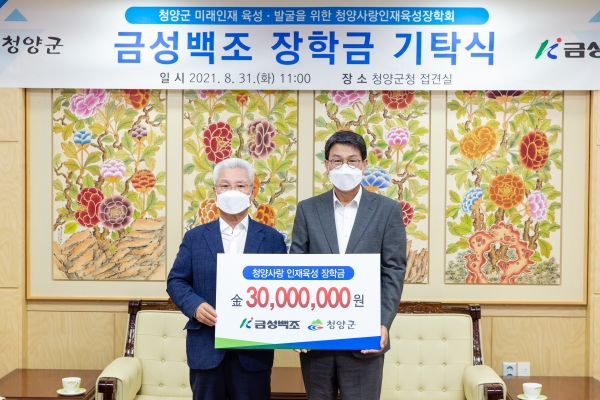 [충청뉴스큐] 금성백조 정성욱 회장이 지난달 31일 청양군을 방문, 미래 세대 육성을 위한 장학금 3,000만원을 전달했다.