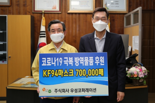 [충청뉴스큐] 서천군은 지난 3일 주식회사 우성코퍼레이션에서 코로나19 감염병 예방을 위해 써달라며 총 3억원 상당의 KF방역 마스크 70만장을 기탁했다고 밝혔다.