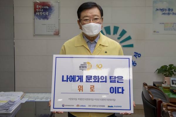 김석환 홍성군수는 양승조 충청남도지사의 추천을 받아 ‘문화의 달을 맞아 “코로나19로 지친 군민들을 위한 위로”라는 문구가 적힌 패널을 들고 촬영하며 챌린지에 동참했다.