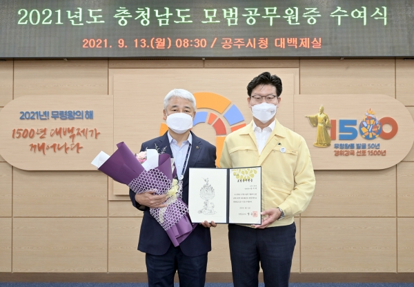 한 팀장은 13일 시청 대백제실에서 열린 2021년도 충청남도 모범공무원 표창장 수여식을 통해 김정섭 시장으로부터 표창장과 꽃다발을 받았다.