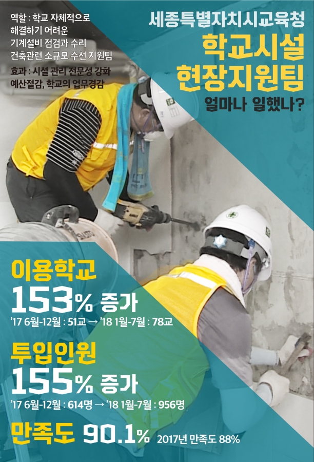 세종특별자치시교육청(교육감 최교진, 이하 세종시교육청)이 지난해 6월부터 운영한 ‘학교시설 현장지원팀’에 대한 학교 현장의 만족도가 매우 높은 것으로 설문 결과가 나타났다고 지난10일 밝혔다. ‘학교시설 현장지원팀’은 전문적 기술력을 갖춘 인력을 투입해 개별 학교 자체적으로 해결하기 어려운 기계설비 점검·수리 및 건축 관련 소규모 수선을 지원하여 학교의 업무 부담을 경감시키기 위해 추진됐다. 지난해 6월부터 12월까지 총 51개교, 연인원 614명, 202건의 학교 시설을 개선했고, 올해는 1월부터 7월까지 총 78교, 연인원 956명, 239건, 총 14개월 간 129개교, 연인원 1,570명, 441건의 학교시설 개선을 지원했으며, 특히, 올해부터는 수목전지와 벤치수선 등 학교 시설 지원 항목을 보다 확대하여 학교가 필요로 하는 시설관리를 맞춤형으로 지원하고 있다. 한편, 세종시교육청이 ‘학교시설 현장지원팀’에 대한 학교 현장의 평가를 반영하여 더욱 질 높은 서비스를 제공하고자 연 2회 만족도 조사를 실시한 결과, 지난해 지원 학교 51개교 대상 88%, 올해 지원 학교 78개교 대상 90.1%가 만족 이상으로 답변했으며, 특히, 올해의 경우 ‘매우 만족’으로 응답한 학교도 60% 이상으로 나나났다. 지원 종목별로는 ▲타일수선 ▲기계설비 점검 ▲용접 ▲보도블럭 수선 순으로 만족도가 높게 나타났다. 세종시교육청은 이와 같은 학교현장의 목소리에 귀 기울여 시설지원에 대한 학교 현장의 만족도를 더욱 높이기 위해 지원인력 증원 등을 적극 검토한다는 계획이다. 김종환 시설과장은 “학교시설관리 업무에 대한 전문적이고 체계적인 유지관리를 통해 안전하고 쾌적한 교육환경을 조성함으로써 학교가 건강한 배움터가 되도록 노력을 아끼지 않겠다”라고 밝혔다.