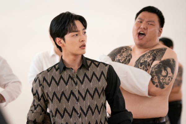 무학은 조직폭력배 스타일의 의상부터 가슴팍과 양팔을 뒤덮은 조악한 문신을 자랑하며 바닥에 드러누워 있다.