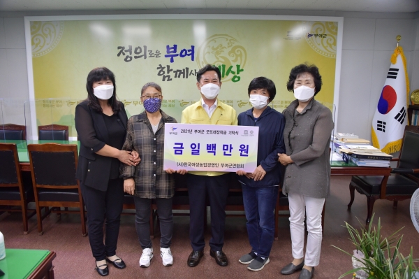 이날 기탁금은 한국여성농업경영인 부여군연합회 회원들이 물티슈, 물행주 등을 판매해 얻은 수익금으로 마련했다.