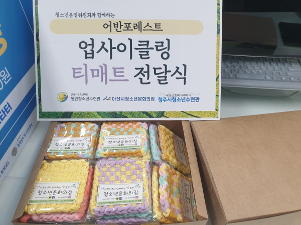 [충청뉴스큐] 아산시청소년문화의집은 결혼이주여성이 바리스타로 채용되어 운영하고 있는 아산시건강가정·다문화지원센터 내 어반포레스트카페에 양말목으로 만든 티매트 50매를 기탁했다.