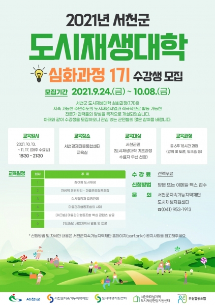 [충청뉴스큐] 서천군지속가능지역재단은 지속 가능한 주민 주도의 도시재생 사업을 위해 적극적으로 활동하는 지역 전문가를 양성하고자, 오는 10월 8일까지 “2021년 서천군 도시재생대학 심화과정” 수강생을 모집한다.
