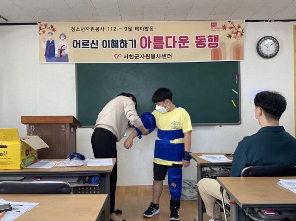 [충청뉴스큐] 서천군 자원봉사센터는 지난 25일 지역 내 중·고등학교 학생 30여명이 참여한 가운데 ‘청소년 자원봉사 112’의 9월 활동으로 지난 21일 치매 극복의 날 및 10월 2일 노인의 날을 기념해 ‘어르신 이해하기 아름다운 동행’이란 주제로 노인 생애 체험 및 노인 교육 활동을 진행했다.