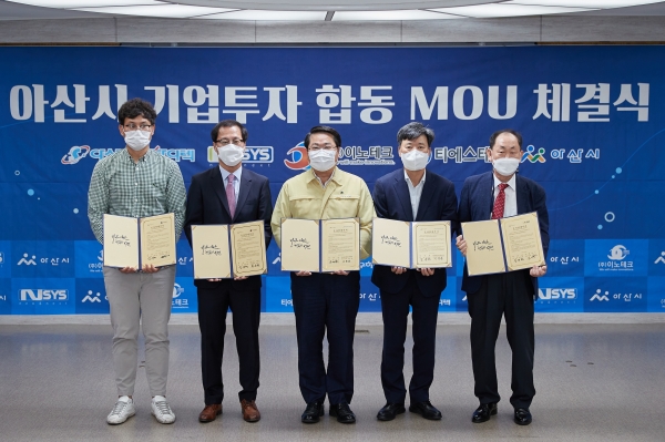 [충청뉴스큐] 아산시가 28일 ㈜아산성우하이텍, ㈜엔시스, ㈜이노테크, 티에스테크 등 4개 기업의 대표와 임직원이 참여한 가운데 생산설비 신설 및 이전을 위한 합동 투자협약을 체결했다.