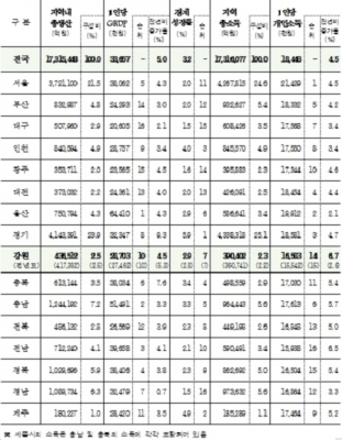 지역총소득은 39조원으로 전년보다 3조원 증가해 지역내총생산 보다 높은 증가율을 보였다. 이에 따라, 지역소득 유출규모는 4조6천억원으로 전년보다 1조1천억원 감소했는데, 도내 기업의 영업이익 확대와 함께 강원상품권 유통에 따른 효과도 일부 반영된 것으로 풀이된다.
