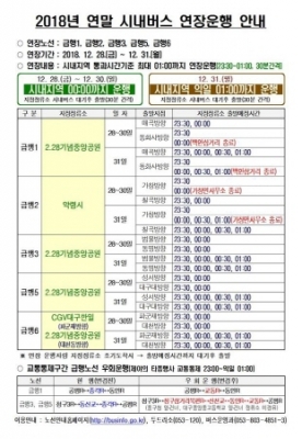 [충청뉴스큐] 2018년 연말 시내지역 유동인구 증가가 예상됨에 따라 시내지역에서 관내 주요지역을 운행하는 급행 5개 노선에 대해 시내지역을 통과하는 시간을 기준으로 최대 익일 01:00분까지 30분 배차간격으로 연장운행한다.