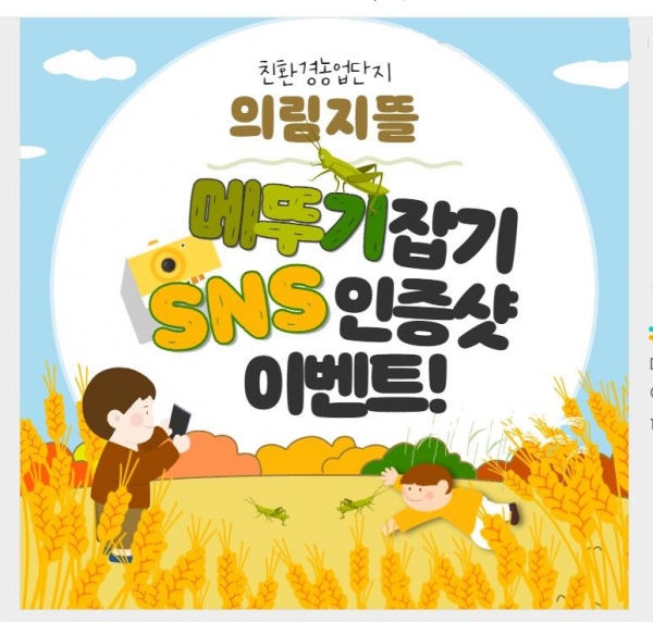 시 관계자는 “계속되는 코로나 확산으로 집합행사 대신 온라인 이벤트로 추진하게 됐다”며 “친환경 들녘에서 잘 자란 메뚜기잡기 체험이 시민들에게 기분 좋은 추억을 선사하기를 바란다”고 말했다.