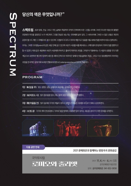 [충청뉴스큐] 공주문예회관이 오는 10월 24일 오후 4시, 공주문예회관 대공연장에서 공주고마무용단 정기공연 ’스펙트럼’ 을 선보인다.