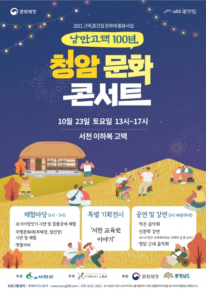 [충청뉴스큐] 서천군은 오는 23일 오후 1시부터 5시까지 서천 이하복 고택에서 체험형 문화예술 인문학 콘서트 ‘낭만고택 100년, 청암 문화 콘서트’를 개최한다고 밝혔다.