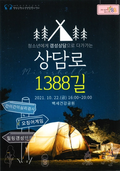 [충청뉴스큐] 청양군청소년재단 산하 청소년상담복지센터가 22일 백세건강공원에서 청소년 안전망 조성을 위한 길거리 ‘상담로 1388길’을 운영했다.