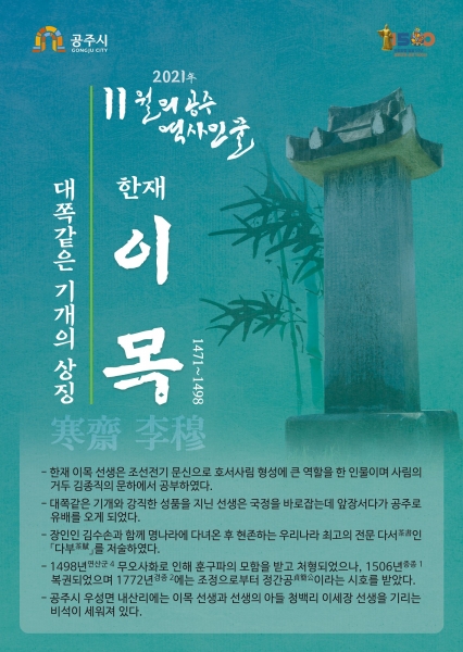 김정섭 시장은 “대쪽같은 기개와 강직한 성품을 지닌 절의의 선비이자 우리나라에 전하는 가장 오래된 차 관련 전문서적을 쓴 한재 이목 선생의 삶과 업적을 기리기 위해 11월의 역사인물로 선정했다”며 “오는 11월 26일 한재 이목 선생 관련 학술특강을 개최할 예정이다”고 말했다.